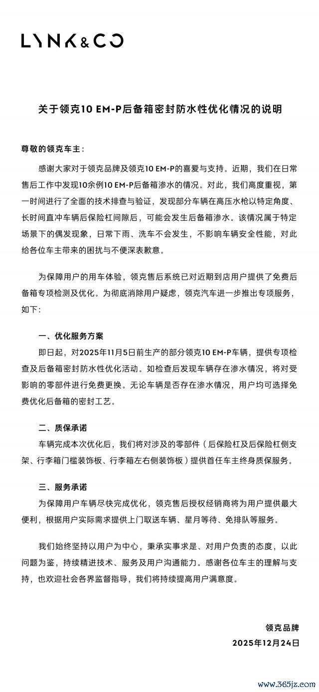 IT 之家 12 月 24 日音书,今天晚间,领克汽车官微发布《对于领克 10EM-P 后备箱密封防水性优化情况的讲明》。